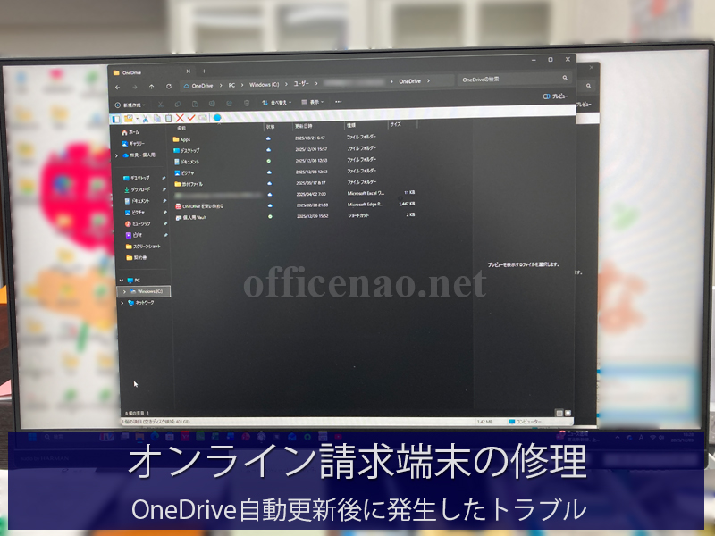 修理としてはOneDriveを削除して元の設定に戻してもよいのですが、それではまた同様のトラブルが発生する可能性もある為、OneDriveはそのままにして、再度オンライン請求・設定マニュアルに従って正しい設定をやり直しました。