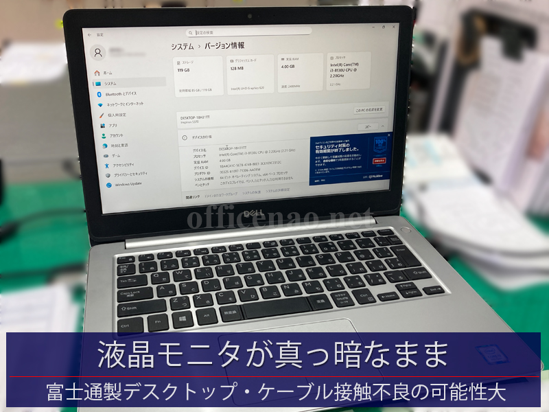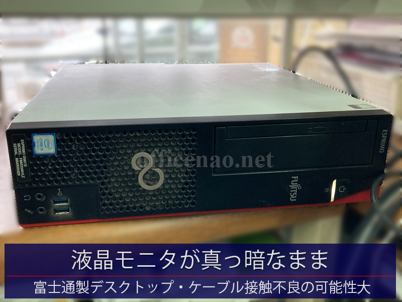 現地にて症状を確認させて頂くと、富士通製デスクトップの本体は電源がONとなっていて、記憶装置へのアクセスランプも常に点滅しており、正常に起動している様子です。