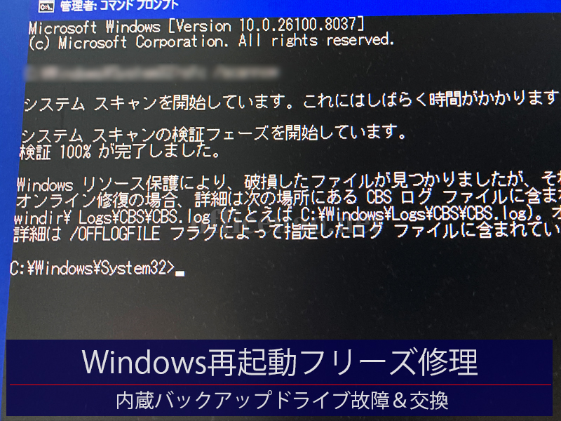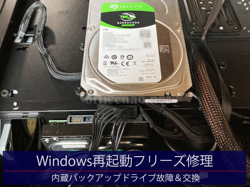 これは内蔵ハードディスクの突発的な故障により、システム全体のレスポンスが異常にしている可能性が高いと考え、内蔵HDDのSATAケーブルを切り離してシステムの動作を確認してみます。すると再起動フリーズが再発しなくなり、システムも非常に軽快に動作するようになりました。