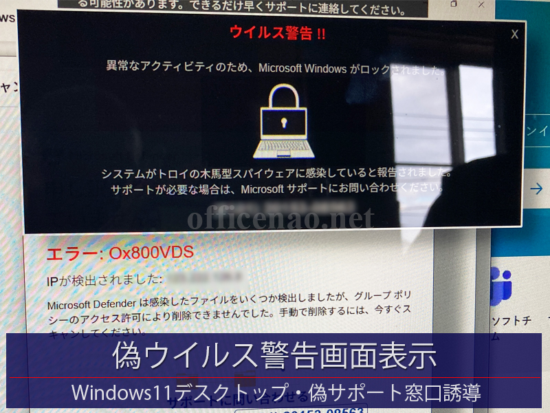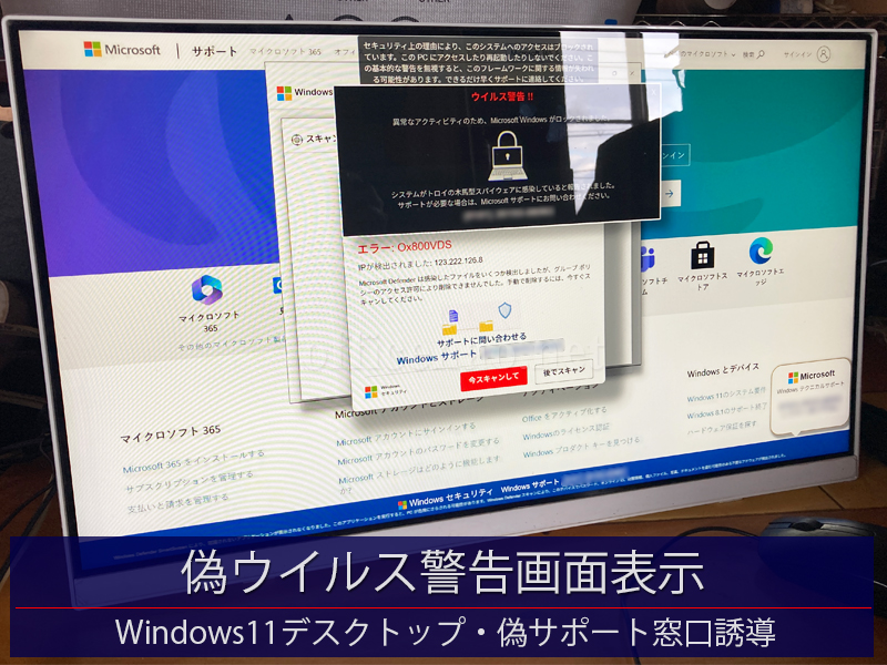 これは偽ウイルス警告というもので、EdgeやChomeなどのブラウザでネットサーフィンをしていると稀に表示されます。