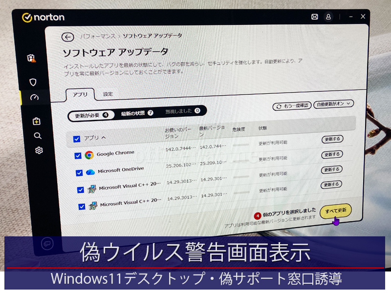 まずはEdgeプロセスを強制終了させ、セキュリティ&ウイルス駆除ソフト(ノートン)を最新にアップデートした後に、セキュリティソフトによるスキャンを行いました。