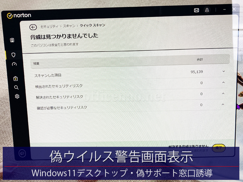 起動(resume復帰)すると、トロイの木馬に感染したというウイルス警告画面が全画面表示されています。